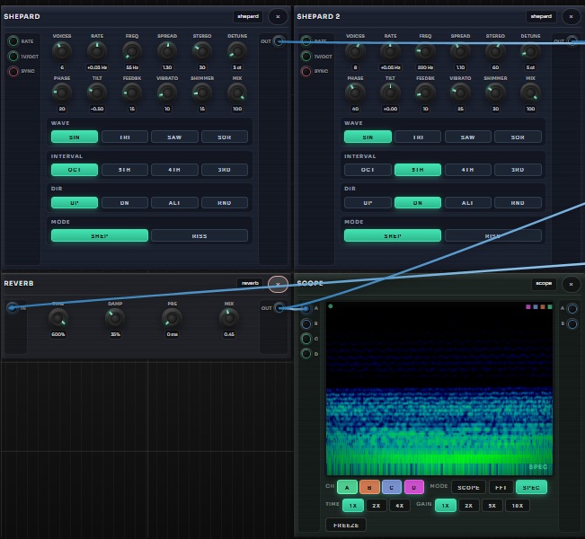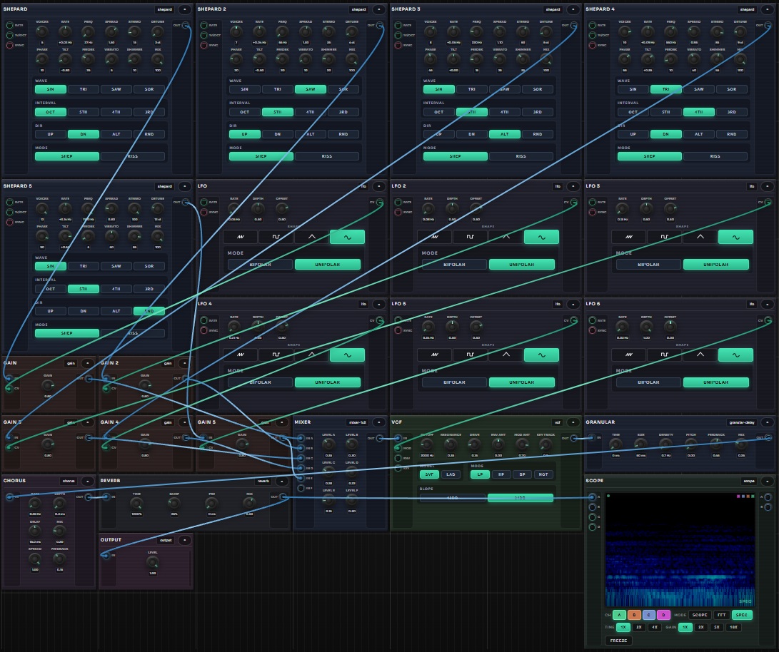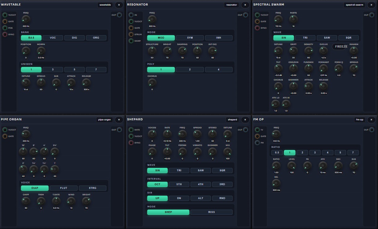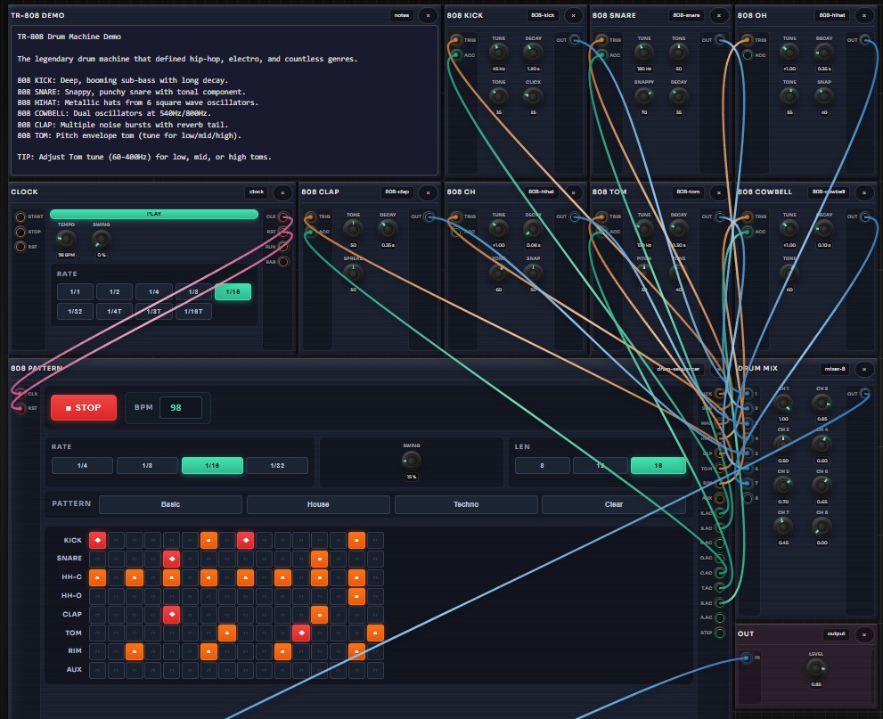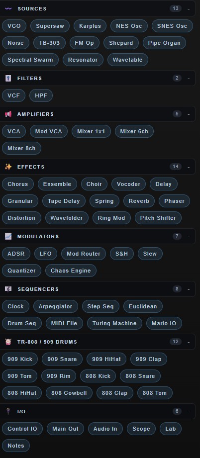 - 68 modules : VCO, Supersaw, Karplus-Strong, NES/SNES Osc, TB-303, FM Op, Shepard Tone, Pipe Organ, Spectral Swarm, Resonator, Wavetable, Granular Sampler, TR-909/808 Drums, Drum Sequencer (8-track), Euclidean Sequencer, MIDI File Sequencer, Turing Machine, Noise, Audio In, Sample & Hold, Slew, Quantizer, Chaos Engine, VCF (SVF/Ladder), LFO, ADSR, Step Sequencer, Arpeggiator, Ensemble/Choir, Delay/Tape/Granular, Spring/Reverb, Pitch Shifter, Wavefolder…