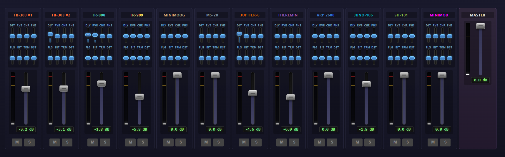 - Volume - Fader par canal (TB-303 x2, TR-808, TR-909, Minimoog, MS-20, Jupiter-8, Theremin, ARP 2600, Juno-106, SH-101, MiniMod)