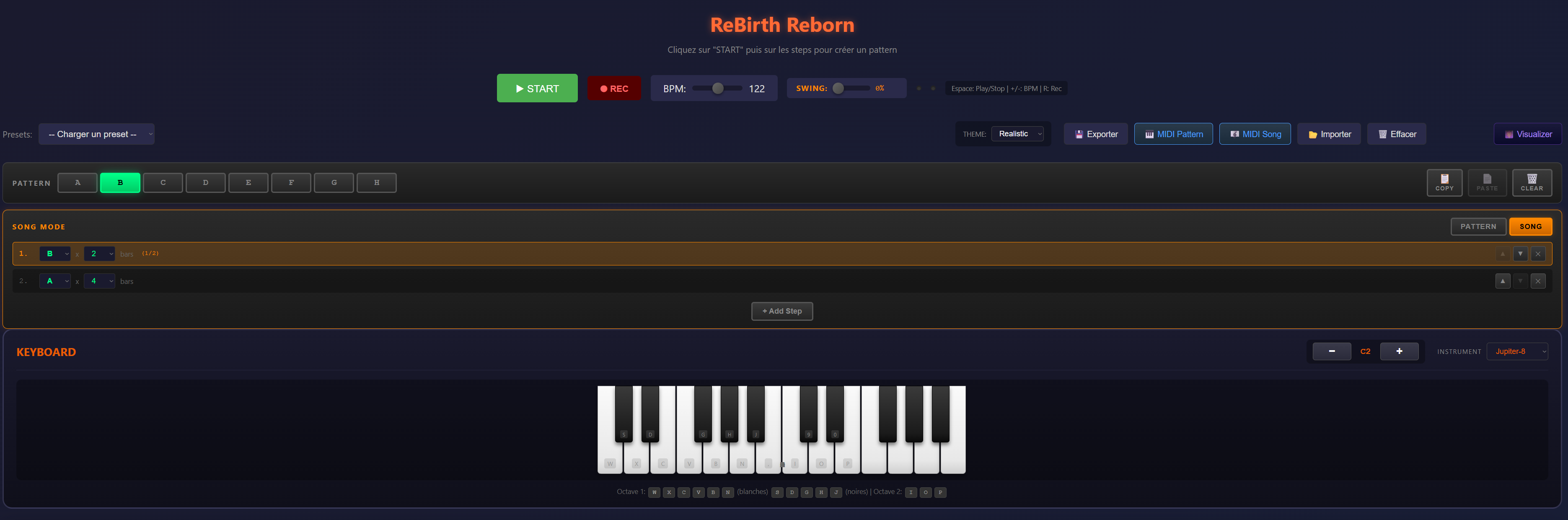 - Export/Import JSON des patterns, paramètres synth, effets, mixer, power states et panel states