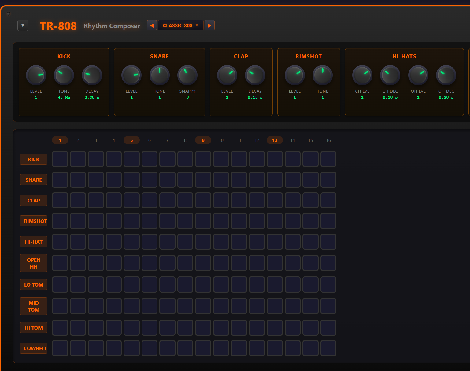 - 1x TR-808 - Rhythm Composer (Kick, Snare, Clap, Rimshot, Hi-Hat, Open Hi-Hat, Toms, Cowbell)