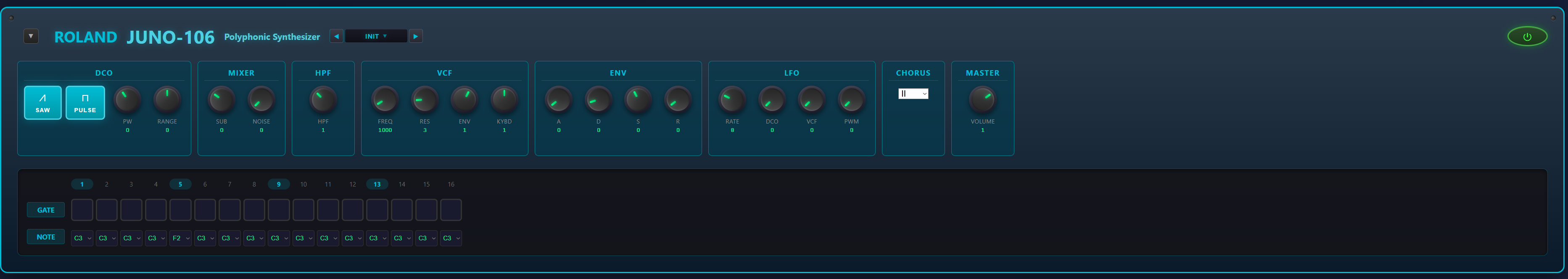 - 1x Roland Juno-106 - 6-voice polyphonic (DCO Saw+Pulse, Sub, Noise, HPF+LPF 24dB, ADSR, LFO, Chorus légendaire I/II/I+II) - 9 presets
